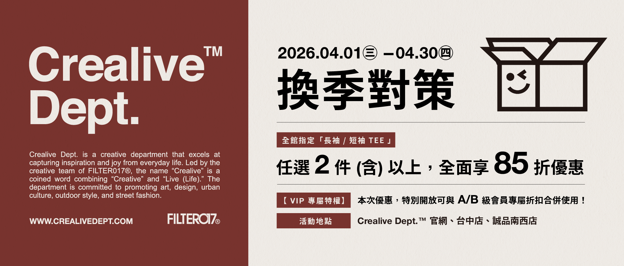 由創意組織FILTER017®團隊主理,以Creative 與 Live(Life) 所複合造字為名,致力推廣藝術設計、城市文化、風格戶外與街頭流行的多元選物概念店。