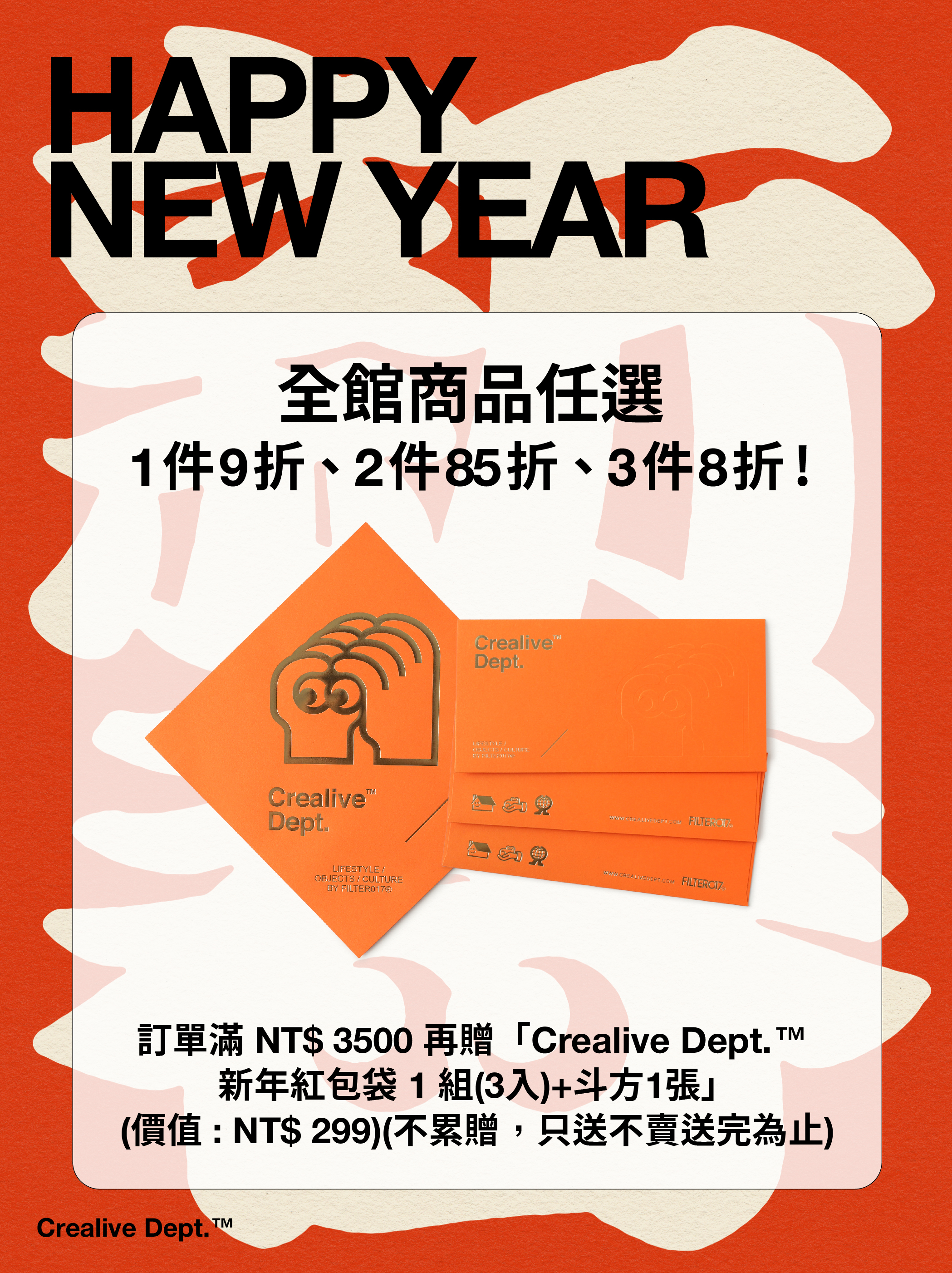 訂單滿 NT$ 3500 再贈「Crealive Dept.™ 新年紅包袋 1 組(3入)+斗方1張」(價值 : NT$ 299)(不累贈,只送不賣送完為止)