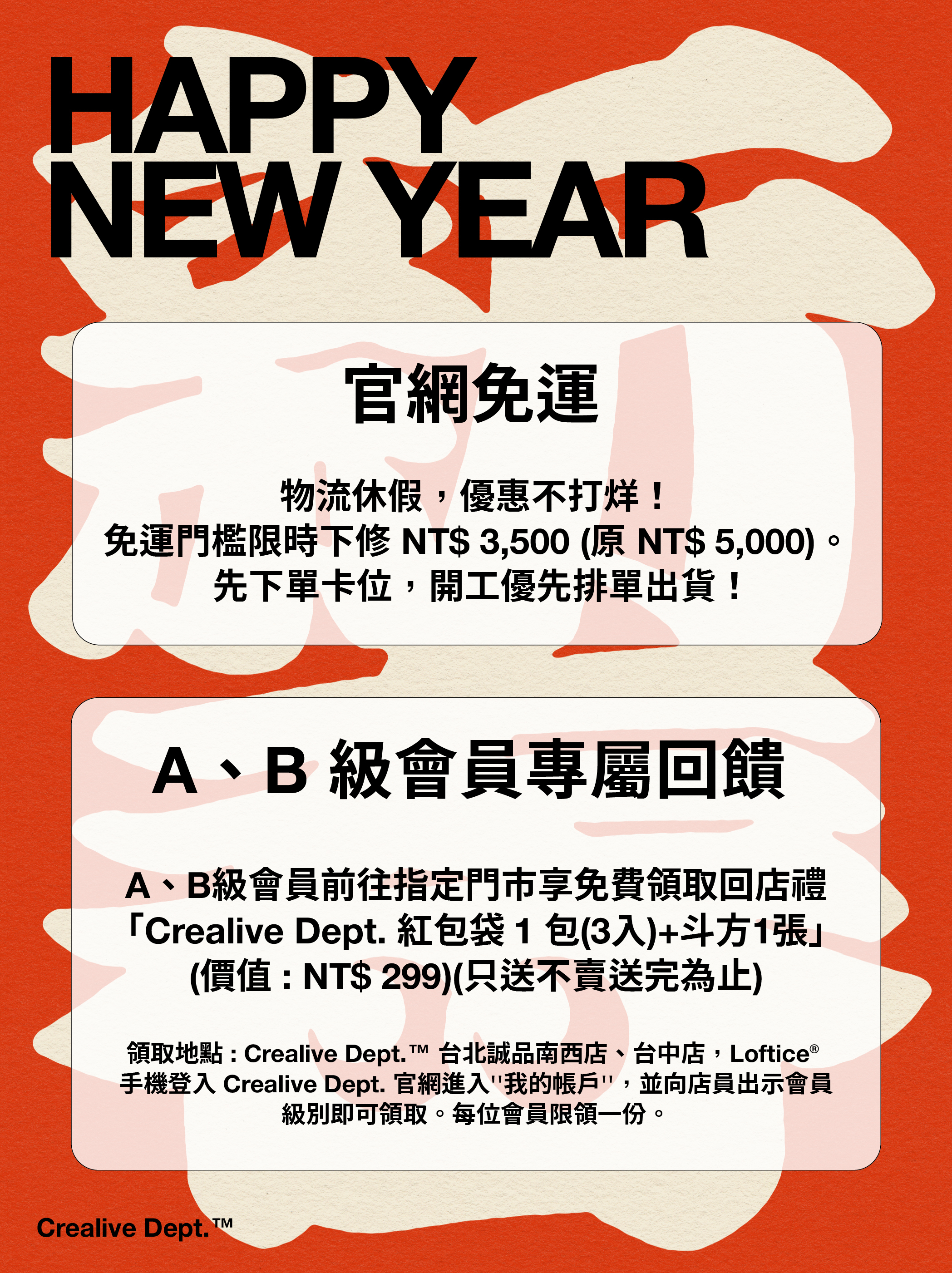 A、B級會員前往指定門市享免費領取回店禮「Crealive Dept. 紅包袋 1 包(3入)+斗方1張」(價值 : NT$ 299)(只送不賣送完為止)