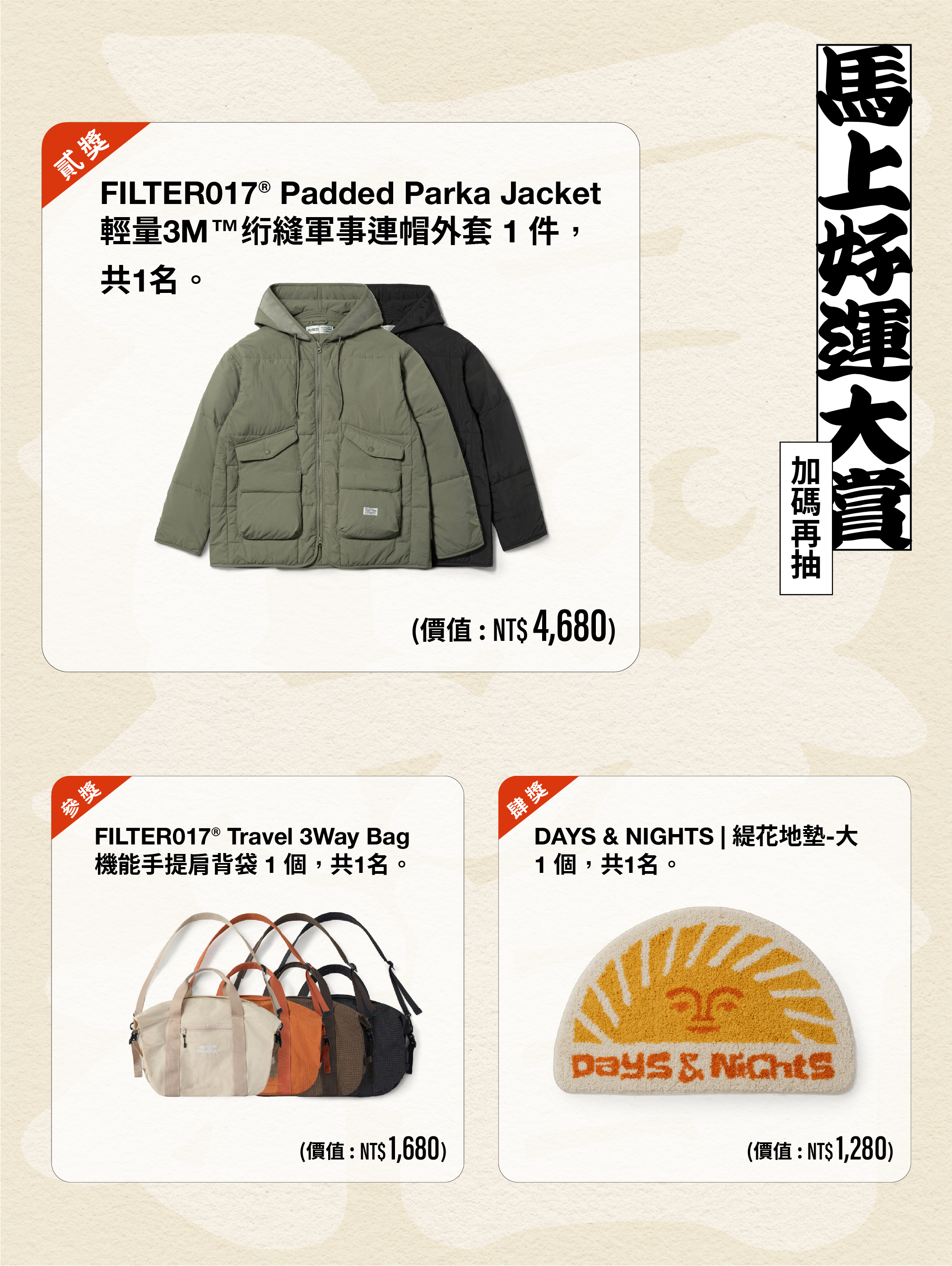* 實體獎項(外套、包袋、地墊): 貳獎、參獎、肆獎之中獎者,可依照兌獎當下之「現有庫存」挑選喜好之顏色與尺寸;若遇該款式/尺寸缺貨,僅能從現有庫存中選擇,恕無法指定調貨或要求預訂。
