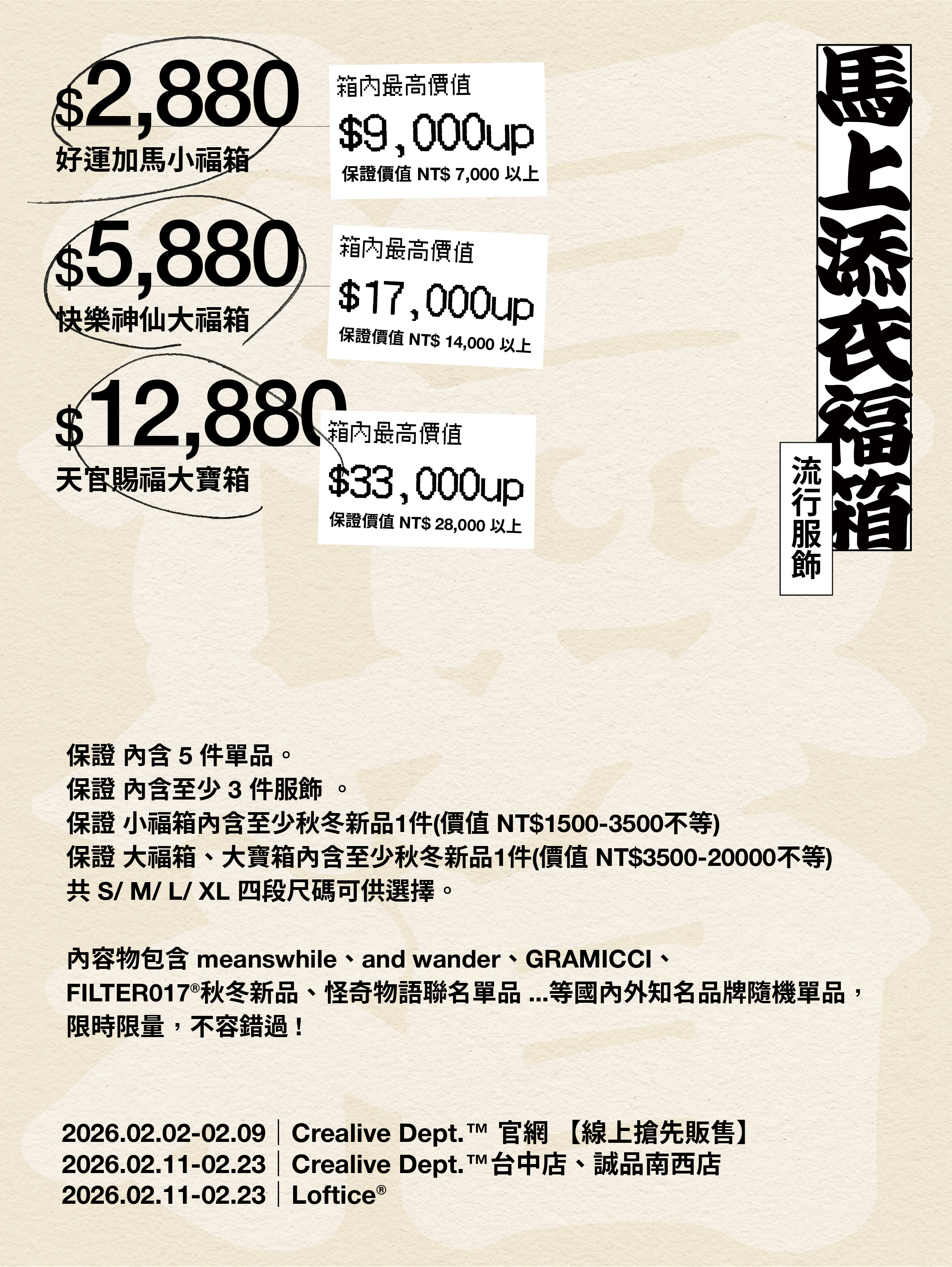 Crealive Dept.™ 好運加馬.NT$ 2880 小福箱|保證價值 NT$ 7000 以上,最高可達 NT$ 9000 以上。