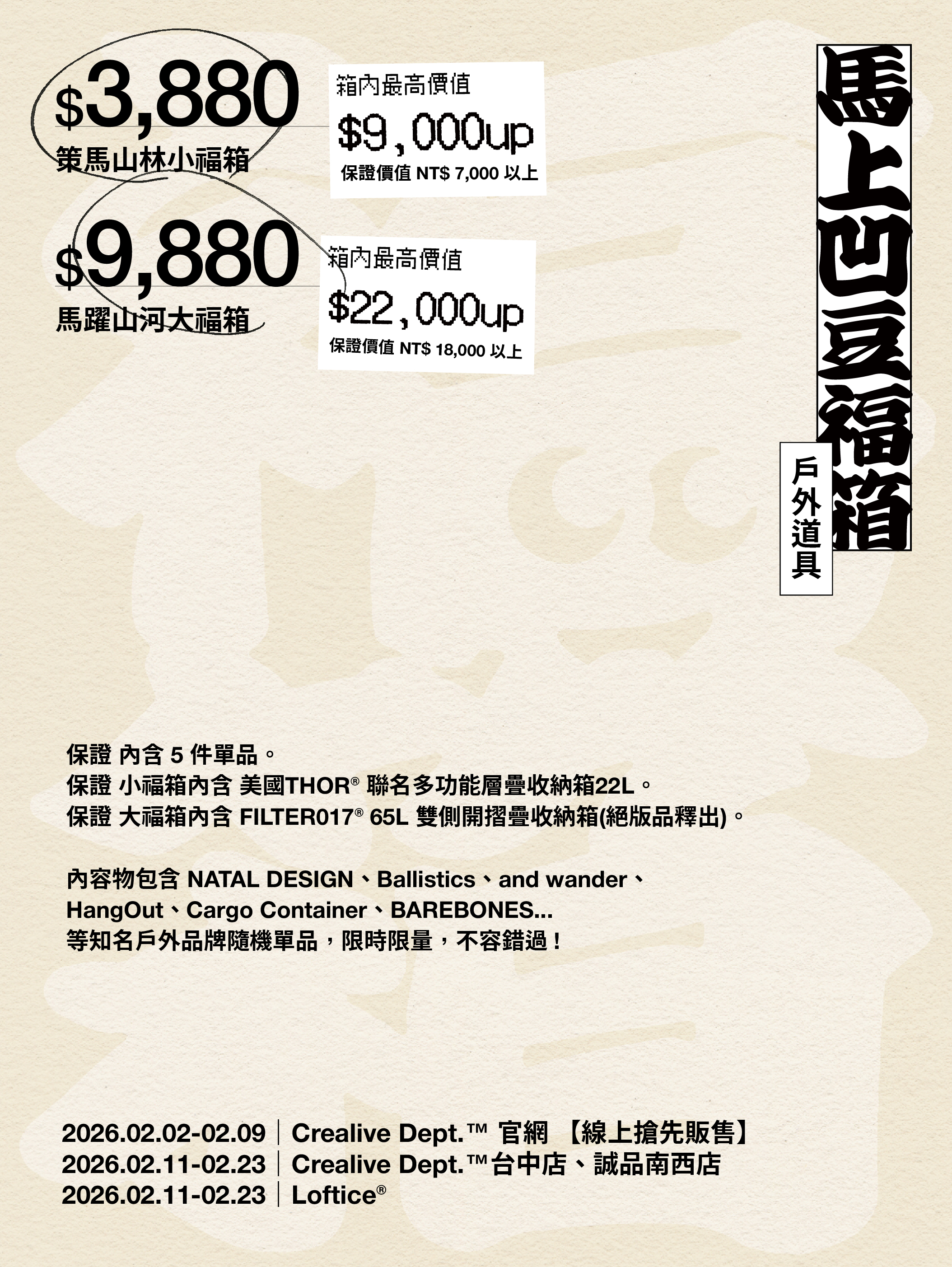 Crealive Dept.™ 策馬山林.NT$ 3880 小福箱|保證價值 NT$ 7000 以上,最高可達 NT$ 9000 以上。